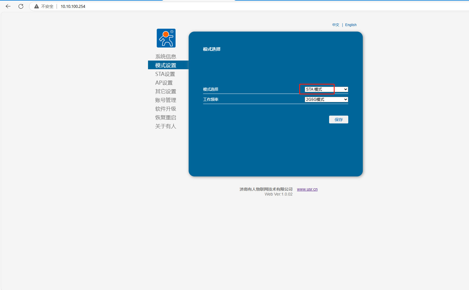2、模式設(shè)置STA模式,點擊保存