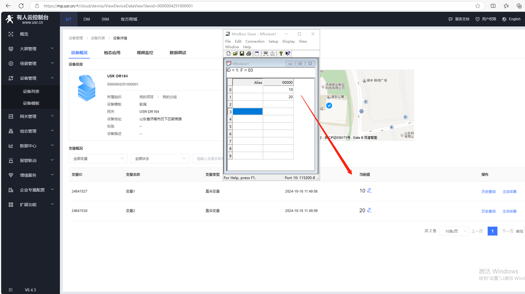 2、MODBUS slave寄存器地址0設(shè)置10,寄存器地址1設(shè)置20,有人云設(shè)備列表1分鐘采集,可以看到變量1采集的當(dāng)前值數(shù)據(jù)10,變量2采集的當(dāng)前值數(shù)據(jù)20。