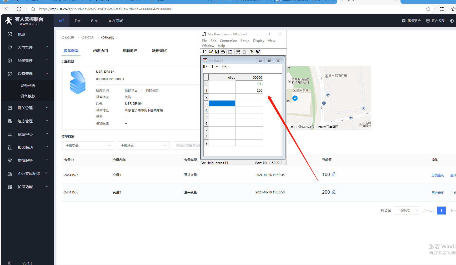 3、有人云寫數(shù)據(jù),向變量1寫數(shù)據(jù)100,向變量2寫數(shù)據(jù)200,MODBUS slave寄存器地址0數(shù)據(jù)變?yōu)?00,寄存器地址1數(shù)據(jù)變?yōu)?00。