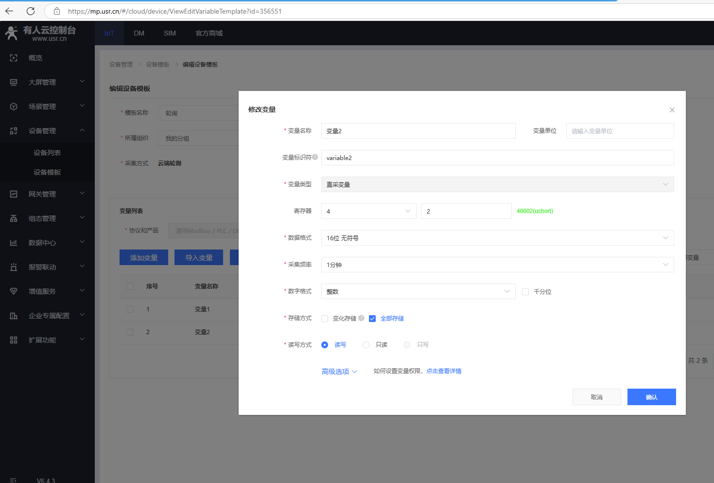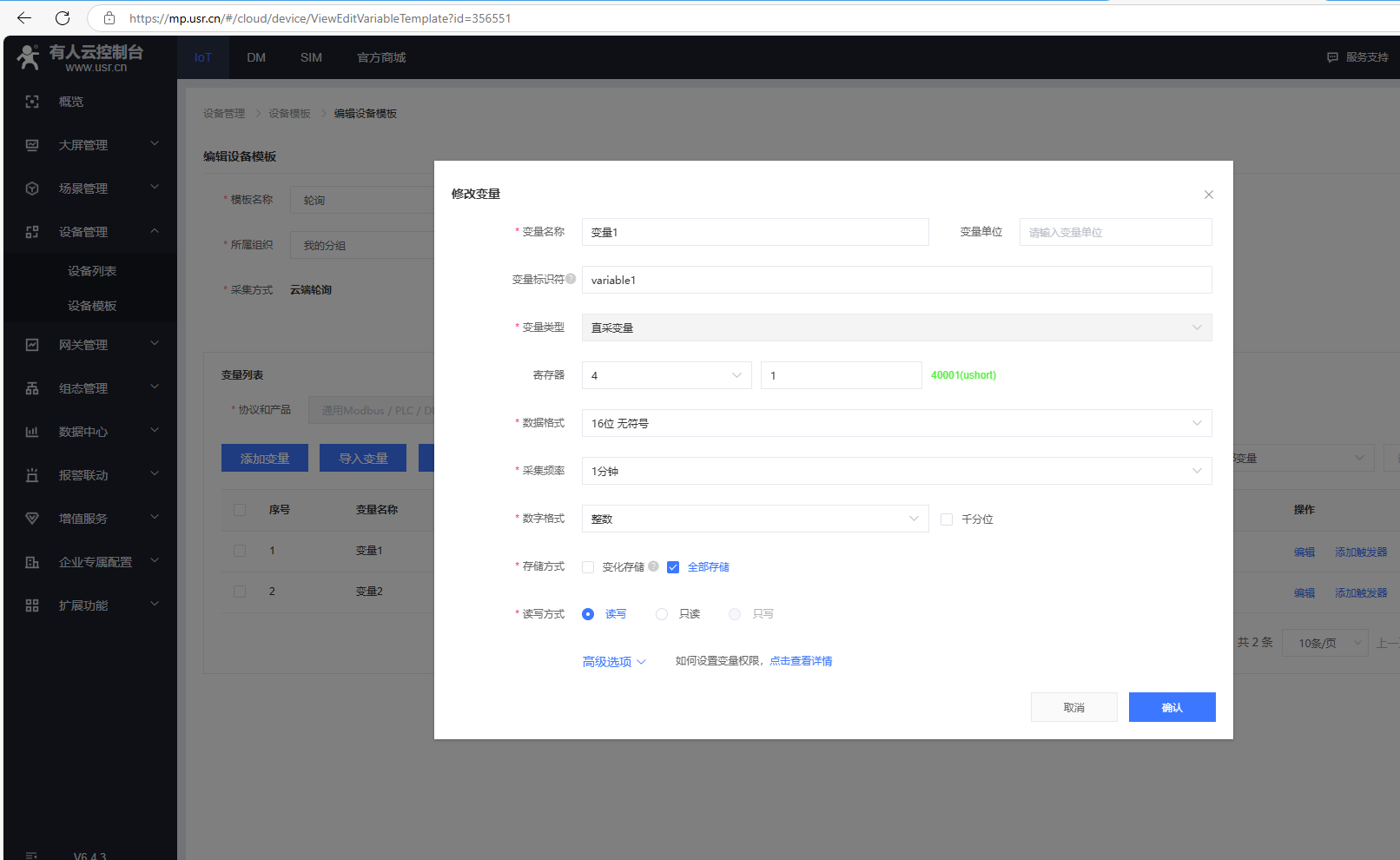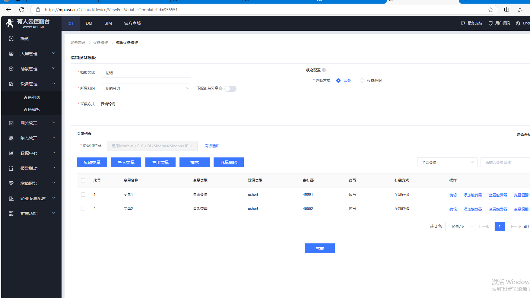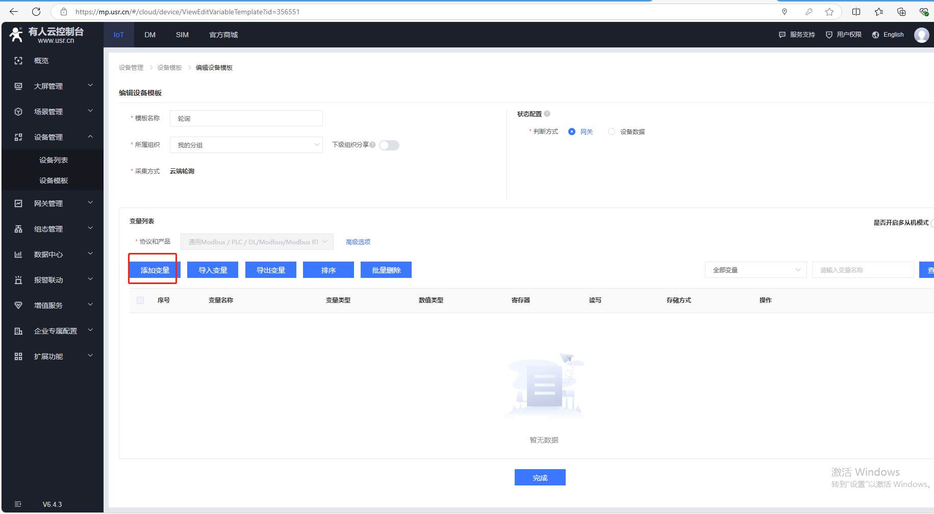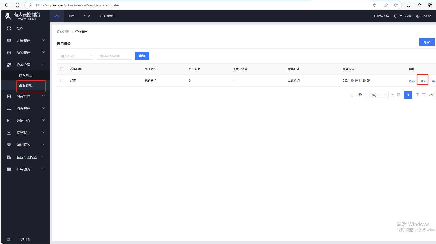 (7)添加變量,點擊設(shè)備管理,點擊設(shè)備模板,點擊編輯。