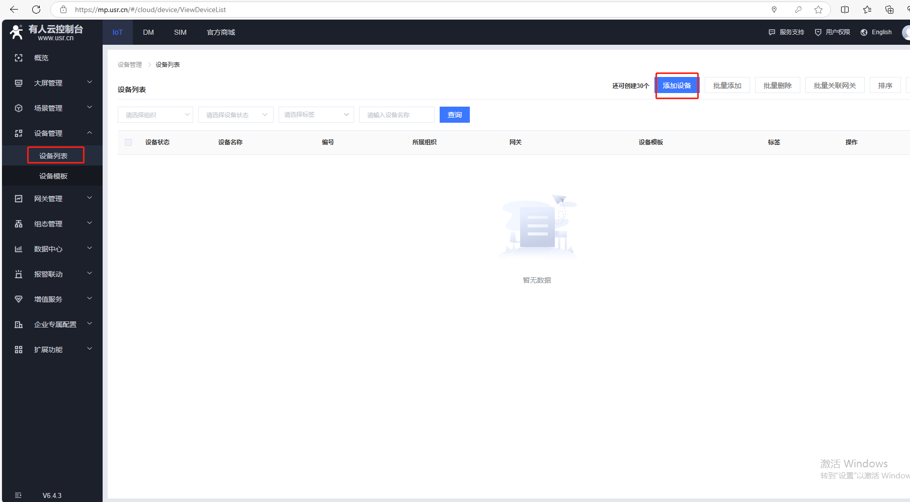 (4)添加設(shè)備,點擊設(shè)備管理,點擊設(shè)備列表,點擊添加設(shè)備。