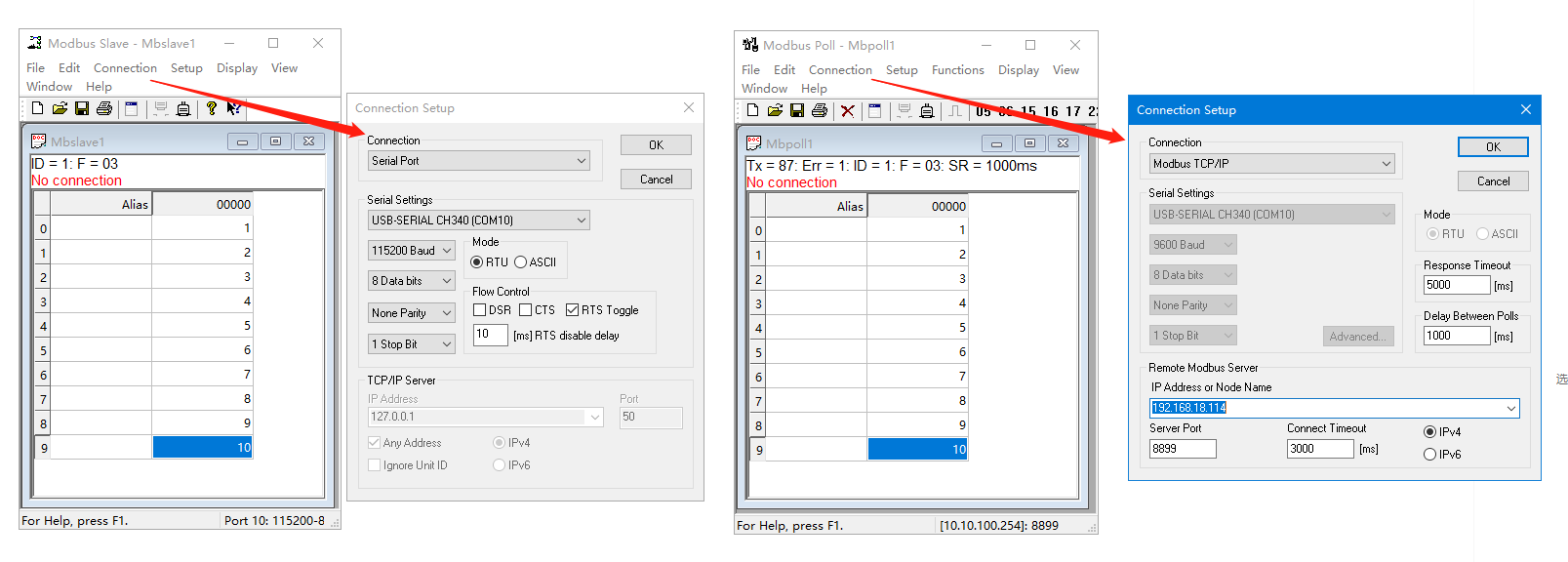 2、打開MODBUS SLAVE和MODBUS POLL軟件,MODBUS SLAVE的Connection選擇串口COM10,串口參數設置和DR164一致。MODBUS POLL的Connection選擇Modbus TCP/IP,IP地址填192.168.18.114,端口填8899。