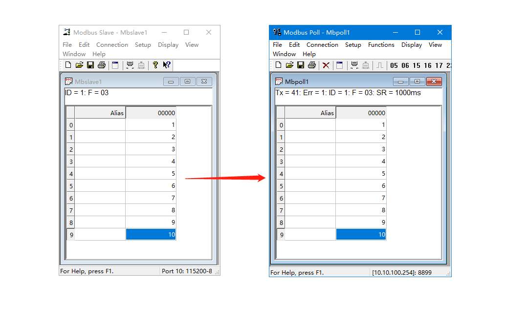 MODBUS SLAVE軟件改變數據,對應MODBUS POLL軟件采集到數據。