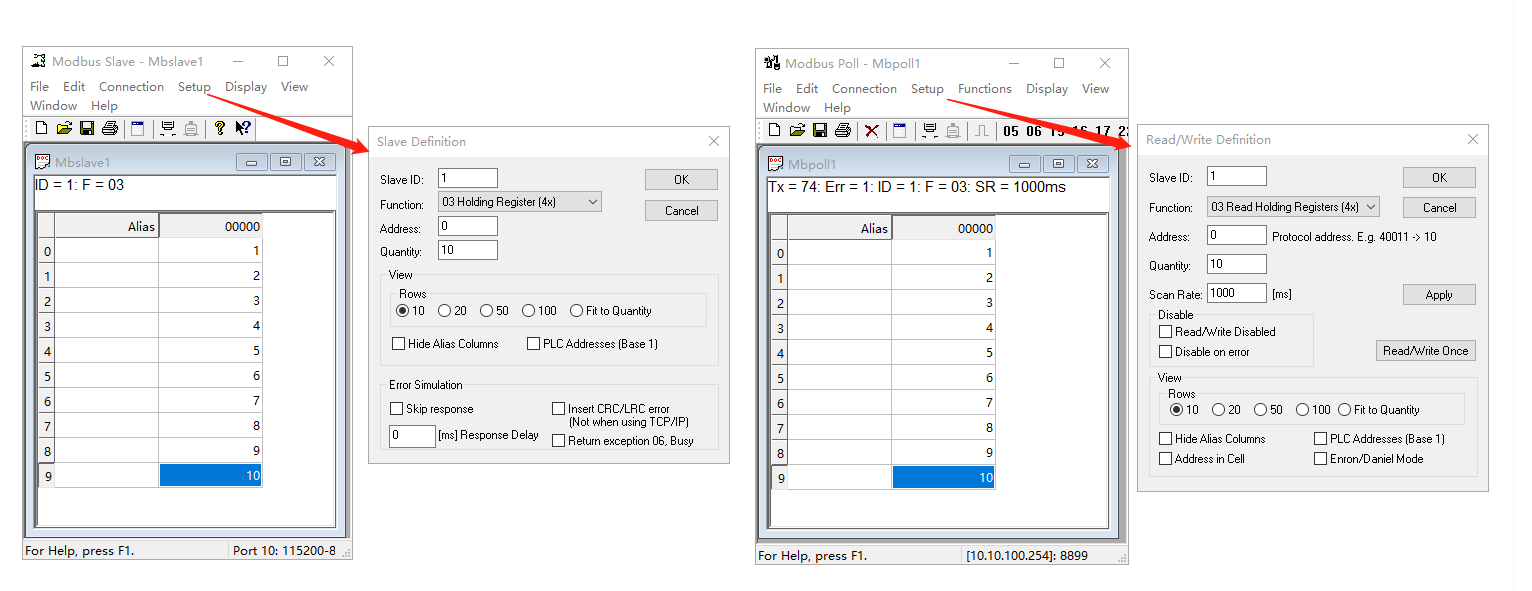 1、打開MODBUS SLAVE和MODBUS POLL軟件,Setup設置一樣,Slave ID 用1,Function 03功能碼,Address寄存器起始地址0,Quantity寄存器數量10。