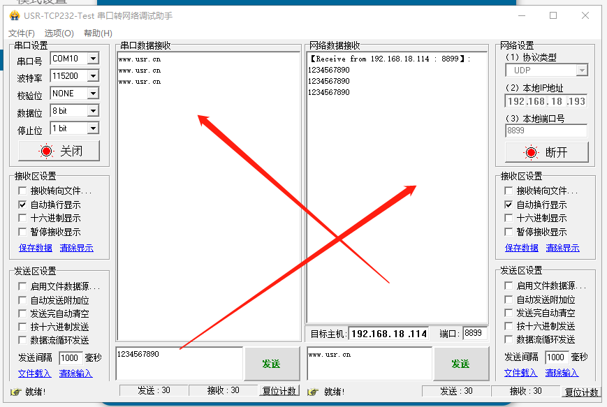 串口再發(fā)送數(shù)據(jù)1234567890,網(wǎng)絡(luò)接收1234567890。