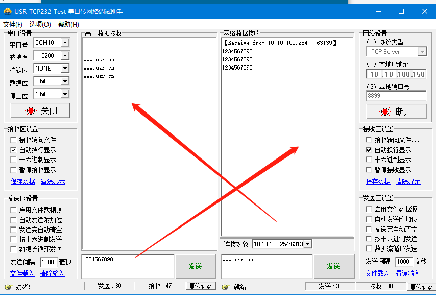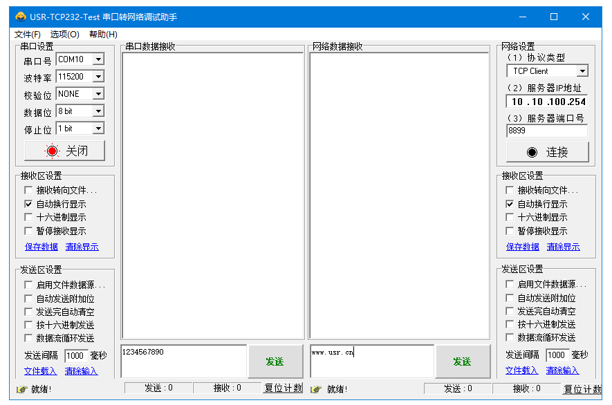 串口發(fā)送數(shù)據(jù)1234567890,網(wǎng)絡(luò)接收1234567890。