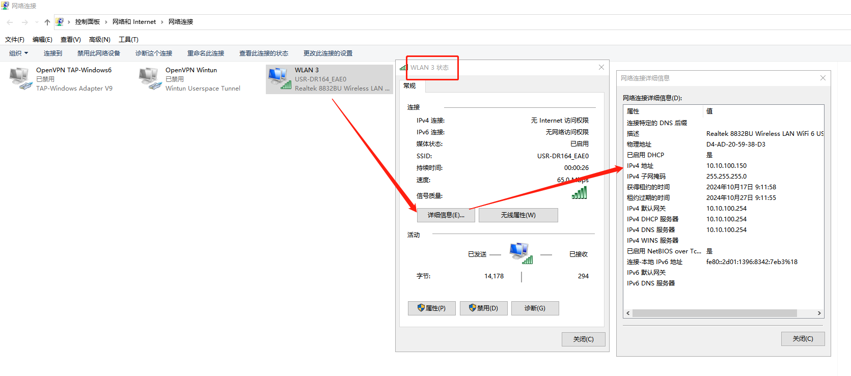 電腦關(guān)閉防火墻,禁用其他網(wǎng)卡,只保留無(wú)線網(wǎng)卡,電腦搜索連接USR-DR164的WiFi。連接之后,電腦打開(kāi)控制面板,網(wǎng)絡(luò)和Internet,網(wǎng)絡(luò)連接,查看無(wú)線網(wǎng)卡狀態(tài),IPv4地址是10.10.100.150