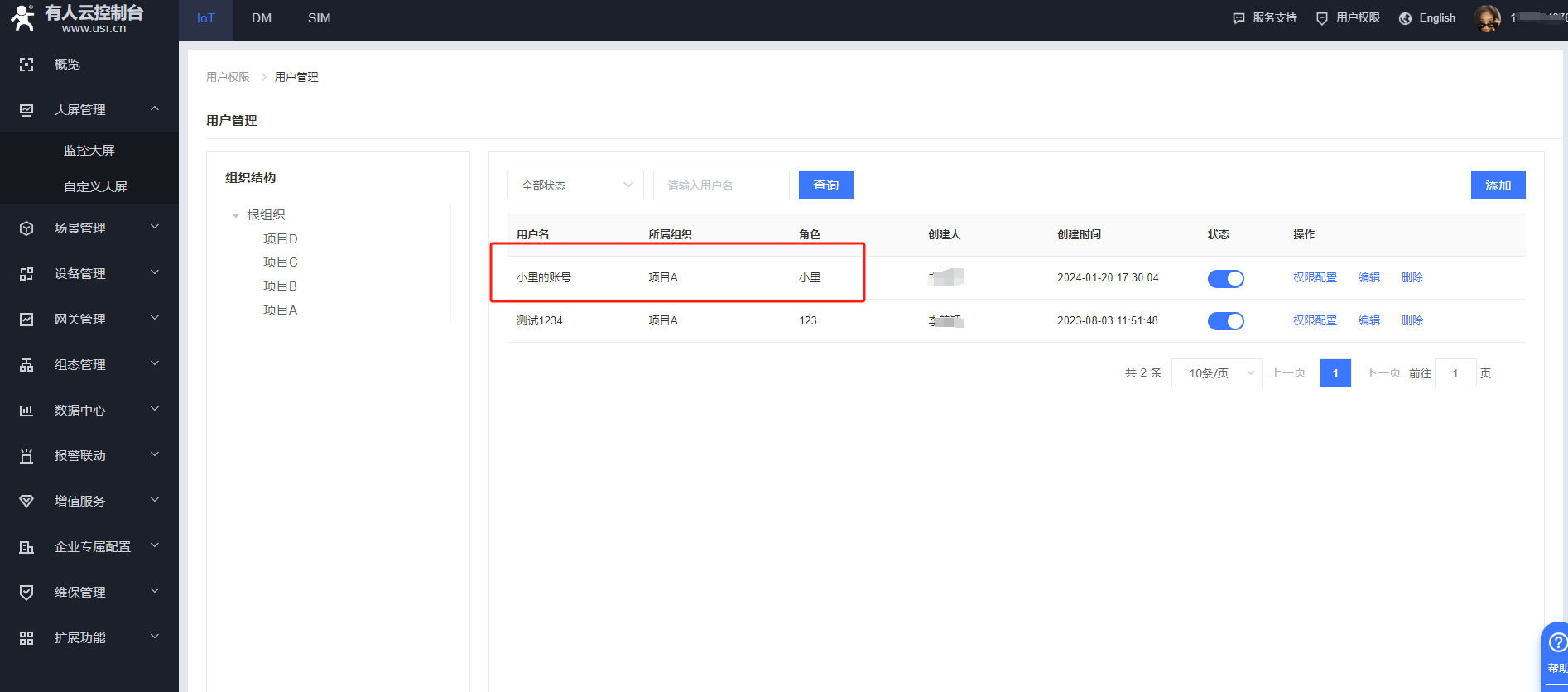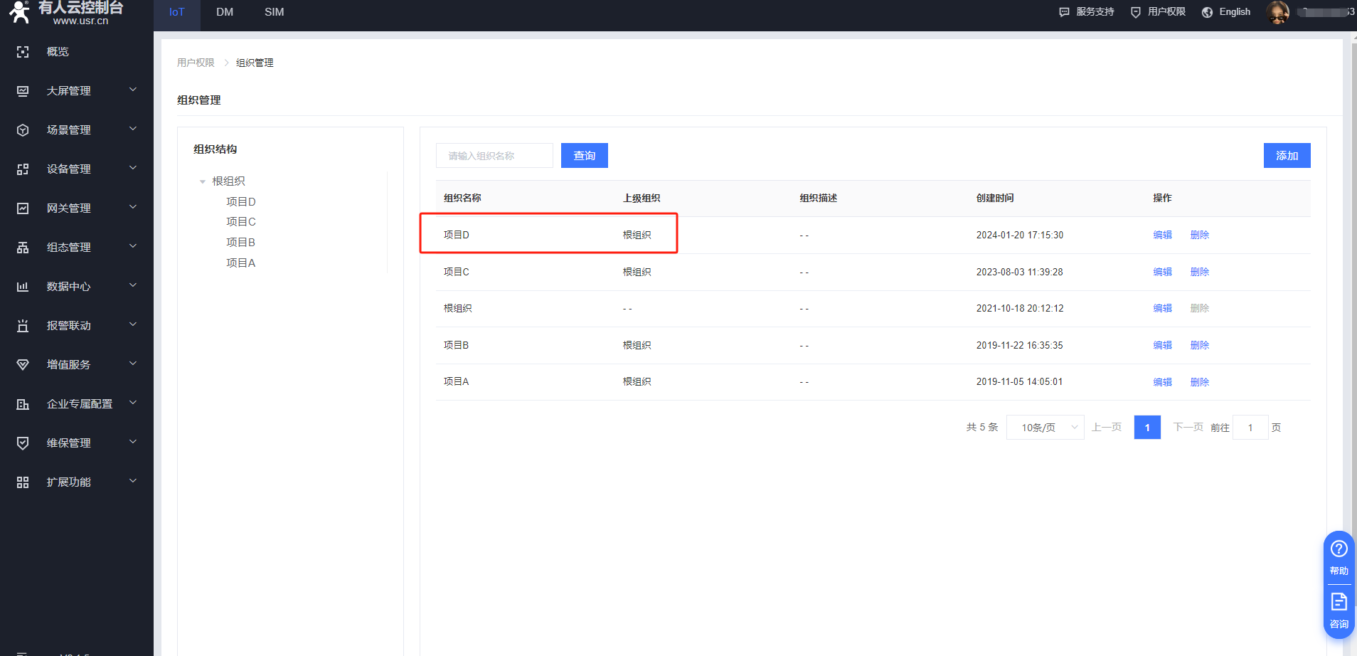 在iot平臺(tái)——用戶(hù)權(quán)限——組織管理,添加新組織,組織名稱(chēng)可以自定義,上級(jí)組織選擇在在哪個(gè)組織下添加為新的組織,案例里上級(jí)組織是選擇的根組織,點(diǎn)擊確定,可以看到新添加的組織