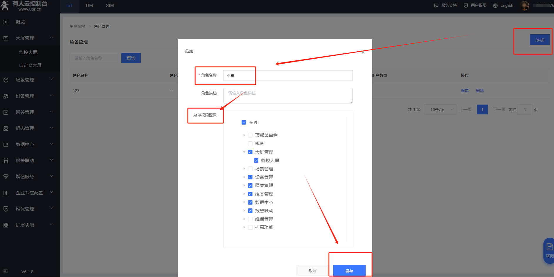 1、首先在用戶(hù)權(quán)限——角色管理,添加角色,選擇要給角色分配設(shè)備權(quán)限,保存