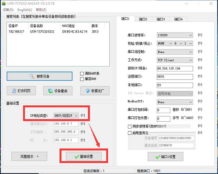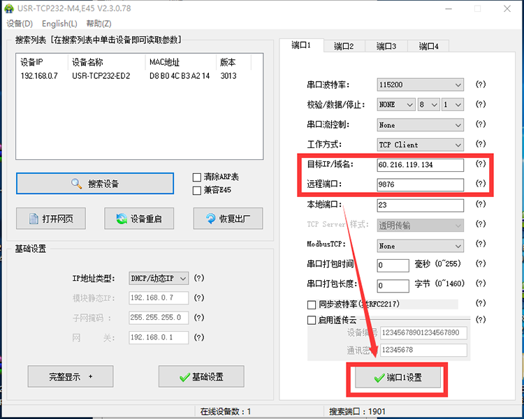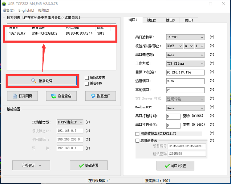 5、打開參數設置軟件USR-TCP232-M4,E45-V2.3.0.78.exe ,點擊“搜索設備”,點擊搜索到的模塊IP,選擇是通過RS485串口還是RS232串口進行通信,此處以RS232串口舉例,配置參數如圖,點擊“端口1設置”