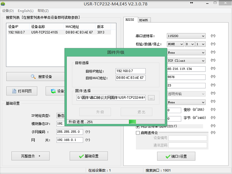 2、點擊一下搜索到的M4產品,點擊右上角的“設備”,選擇“固件升級”。