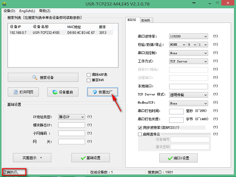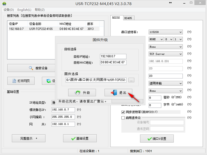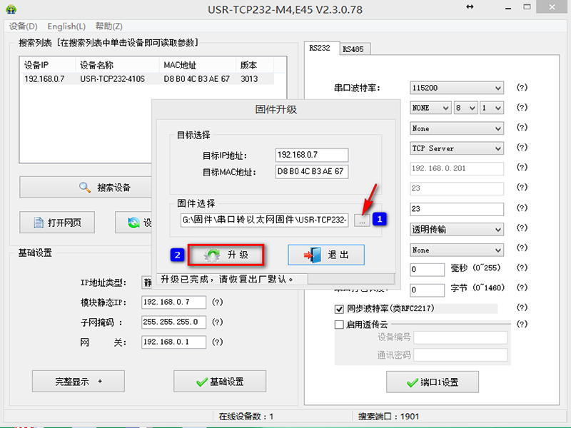將電腦和M4產品直接網線對接,設置電腦IP和M4在同一個網段,使用配置軟件搜索設備后升級固件,升級完成后點擊“恢復出廠設置”才能正常使用。