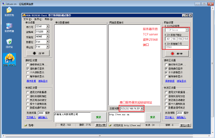 (3) 服務器接收和發送串口GPRS模塊的串口數據。