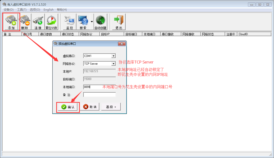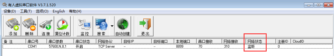 9.使用虛擬串口軟件建立TCP Server網絡監聽(使用時需要將Test調試助手軟件創建的Server監聽關閉,不能同時使用)