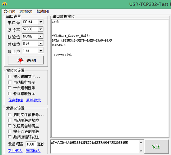 三、進入AT指令模式,更改BLE的UUID,3個UUID全部改完后,設置BLE工作模式為主模式,然后發送AT+Z重啟。
