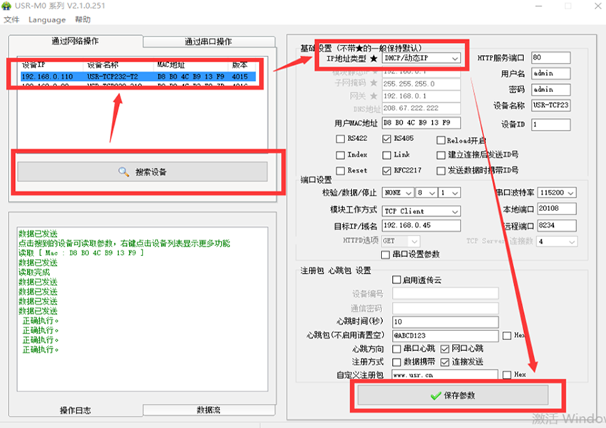 1、將M0模塊網線直連電腦,打開參數設置軟件(下載地址http://www.0575400.com/Download/257.html),點擊“搜索設備”,點擊搜索到的設備名稱,將IP類型改為“DHCP”,點擊“保存參數”,如圖