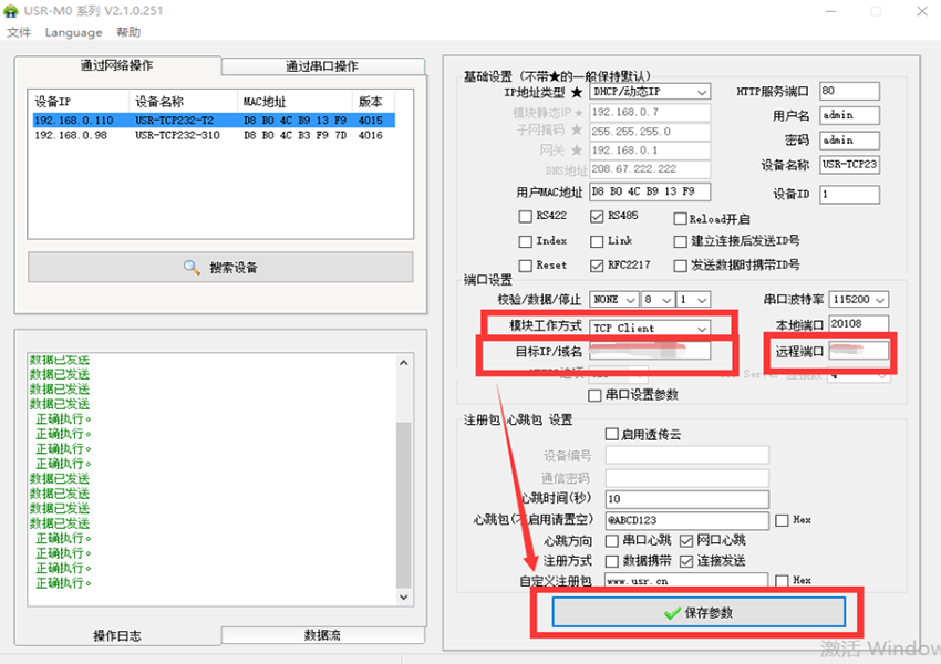 3、將M0模塊網線直連路由器,電腦連入該路由器,打開參數設置軟件,重新搜索設備,設置模塊工作方式為“TCP Client”,目標IP為公網服務器的公網IP,遠程端口號為服務器上上位機軟件的端口號。點擊“保存參數”,如圖