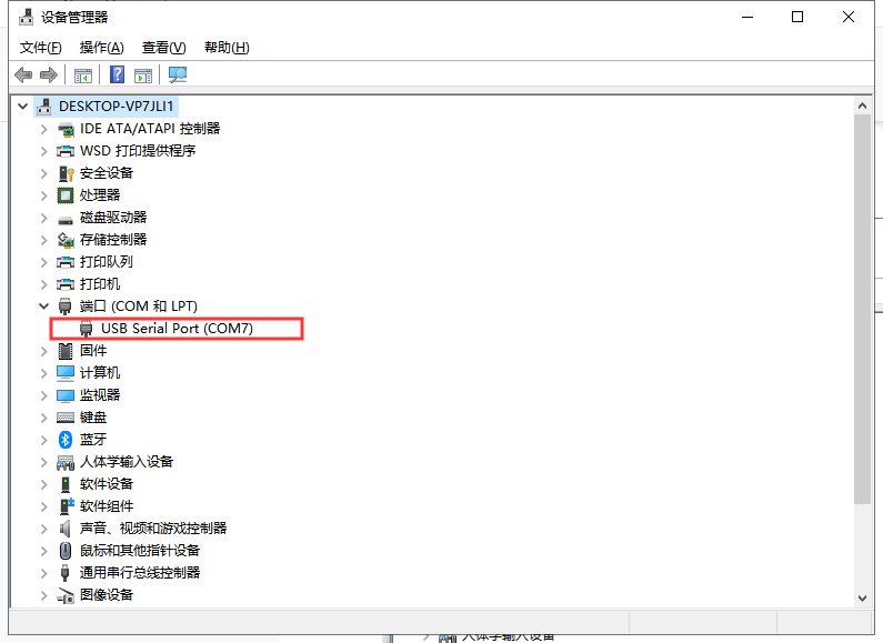 其中串口號可以在電腦的“設(shè)備管理器”中查看,見下圖;