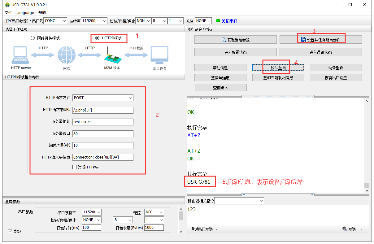 5>待重啟完畢后會在串口打印USR-G781字樣,表示設(shè)備啟動完成。