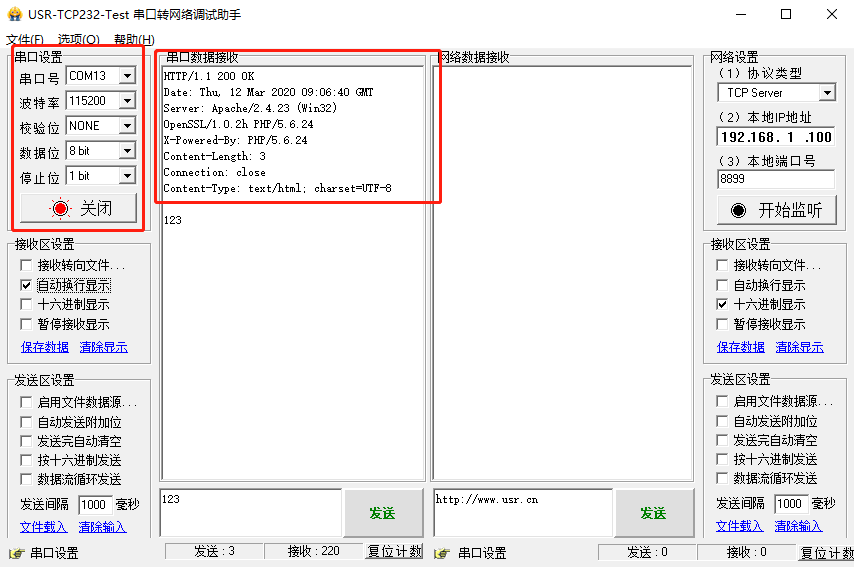在發(fā)送區(qū)填寫數(shù)據(jù),點擊發(fā)送,則可在接收區(qū)域接收到服務(wù)器的返回,其中HTTP頭信息可以設(shè)置過濾掉。