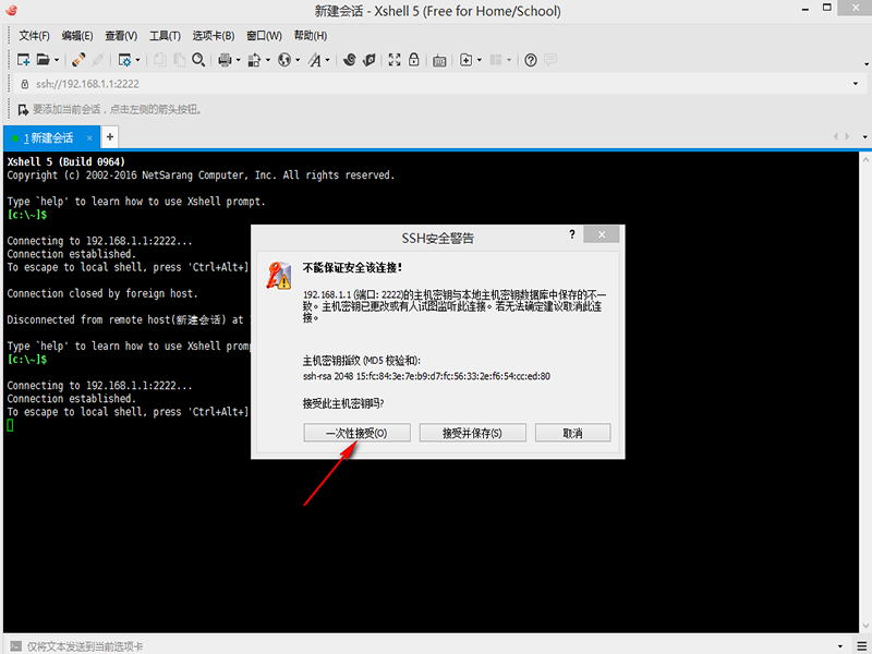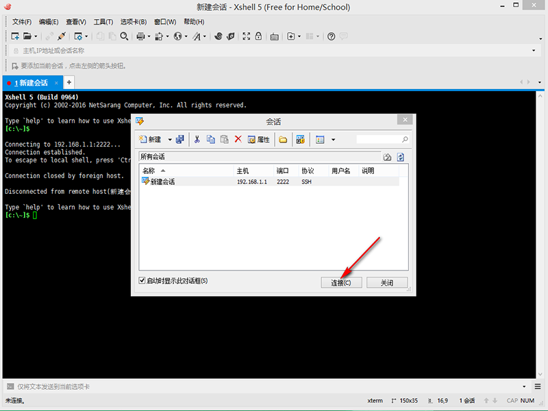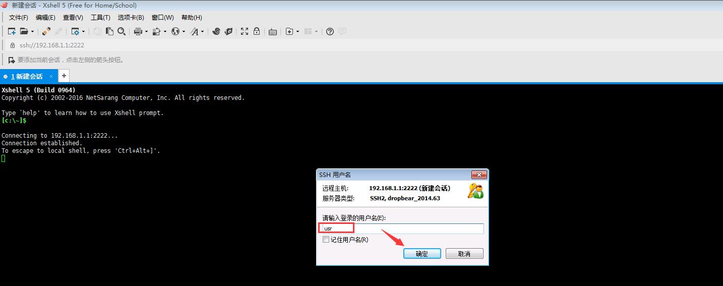 6、協議選為ssh 主機填寫192.168.1.1 端口號填寫2222,點擊“確定”