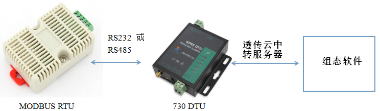 1.3 實現(xiàn)功能:串口設(shè)備連接DTU,DTU設(shè)置參數(shù)后與透傳云服務(wù)器連接,組態(tài)王連接虛擬串口軟件,實現(xiàn)組態(tài)王發(fā)送MODBUS RTU協(xié)議的請求數(shù)據(jù),MODBUSRTU下位機返回對應(yīng)的參數(shù)值