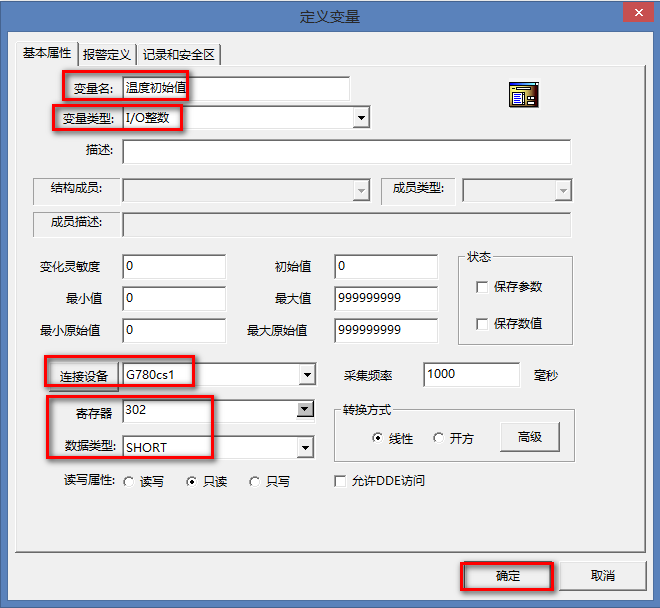 (2)新建變量:溫度初始值,選擇變量類型:IO 整數(shù),連接設(shè)備為新建的設(shè)備名:G780cs1,寄存器302,代表功能碼為04,起始地址0的第二個值。