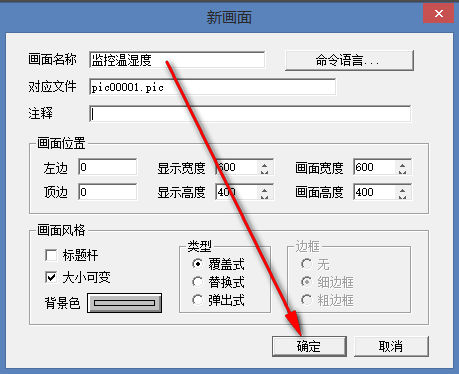 4.8 點擊“畫面”,新建一個畫面,畫面名為監(jiān)控溫濕度,點擊“確定”,進入畫面編輯欄。