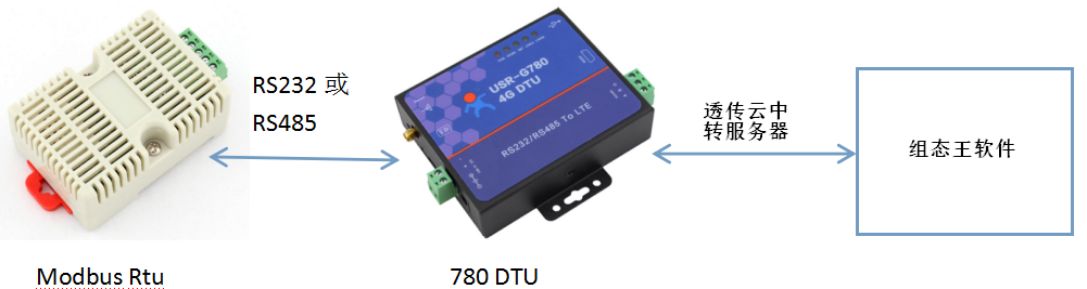 1.3實現功能:串口設備連接DTU,DTU設置參數后與透傳云服務器連接,組態王連接虛擬串口軟件,實現組態王發送MODBUS RTU協議的請求數據,MODBUSRTU下位機返回對應的參數值。