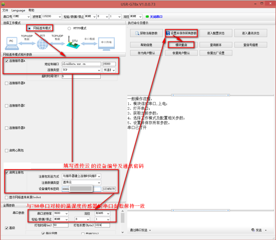 3、設置完參數后,將780串口與溫濕度傳感器對接上,連接服務器。