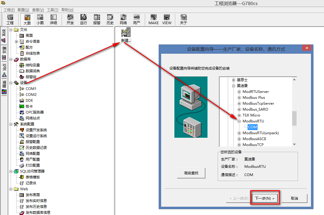 4.3點擊設備,新建一個組態設備,選擇 PLC-莫迪康-Modbus