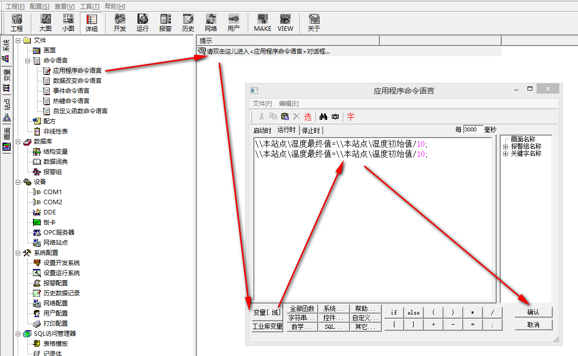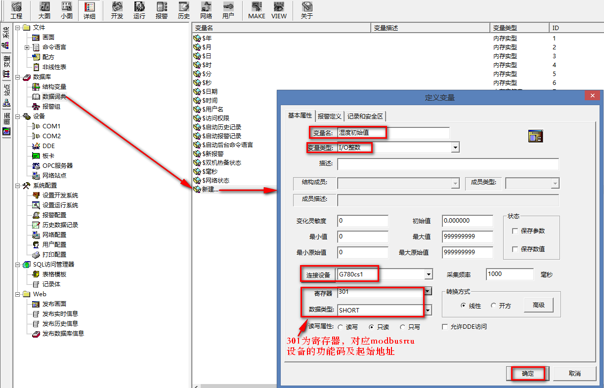 (1)新建變量名:濕度初始值,選擇變量類型:IO整數,連接設備為新建的設備名:G780cs1,寄存器301,代表功能碼為04,起始地址0的第一個值。