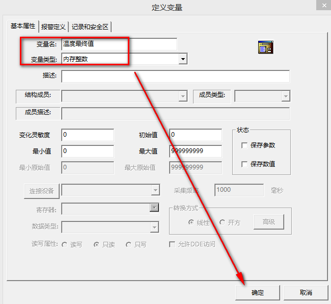(4)新建變量名:溫度最終值,選擇變量類型“內存整數”,點擊“確定”。