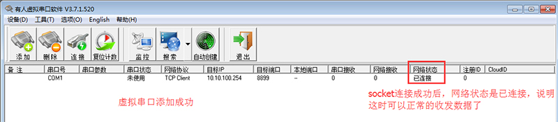 1>添加虛擬串口,網絡協議TCP client,服務器IP地址10.10.100.254,服務器端口號8899,確認