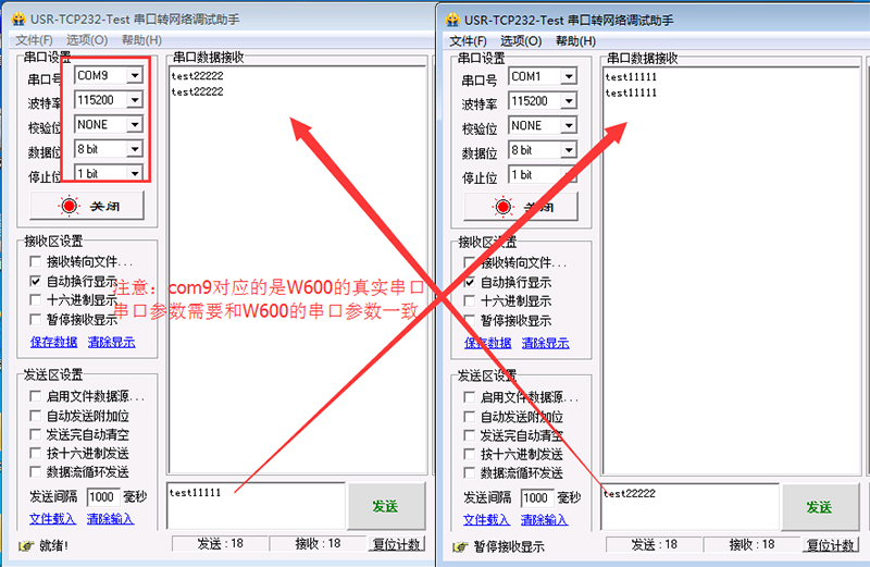 3、W600配合虛擬串口進行數據傳輸(用虛擬串口測試,需要斷開上面小黃人的網絡連接)