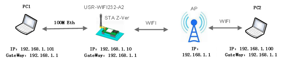 高性能模塊(一下簡(jiǎn)稱(chēng)A2)通過(guò)Wi-Fi接到AP上,PC1通過(guò)以太網(wǎng)接到A2模塊上,這時(shí)A2模塊相當(dāng)于一個(gè)透明的設(shè)備,PC1和PC2在同一個(gè)局域網(wǎng),相互通訊不受任何限制,如果AP可以聯(lián)網(wǎng),那么PC1也是可以上網(wǎng)的。下面介紹如何設(shè)置A2模塊,才能實(shí)現(xiàn)這種功能。