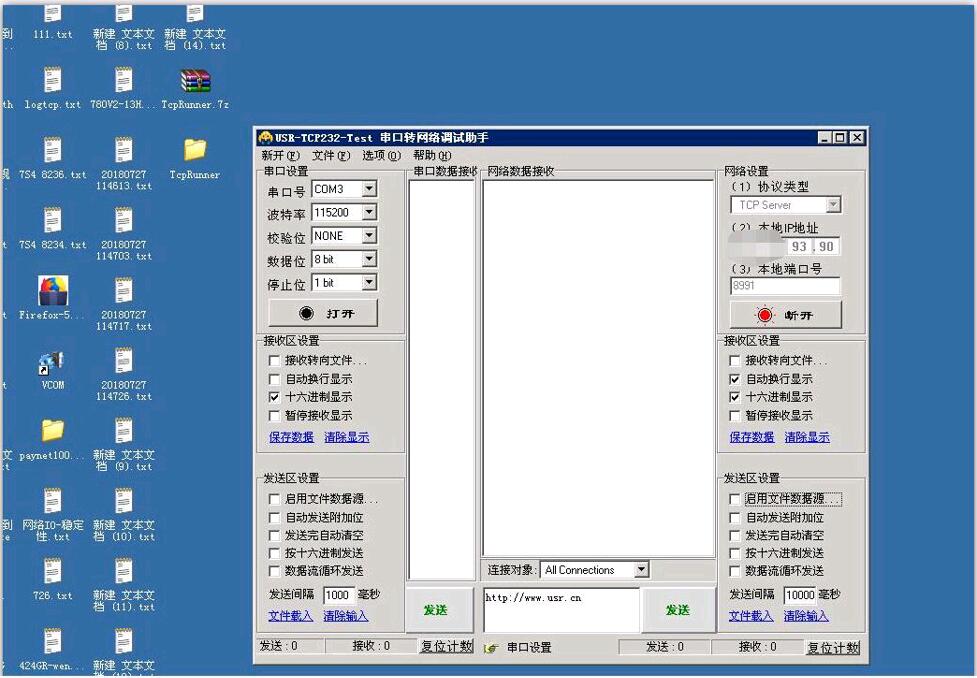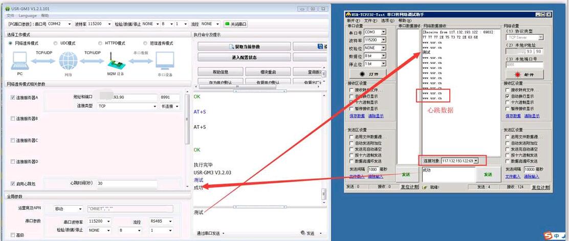 3. 在服務器端,可以看到已經有連接對象了,串口和服務器端能正常收發數據,當串口長時間不發送數據的時候,DTU會主動發送心跳包給服務器(該功能可以取消,具體參考730的軟件設計手冊)。