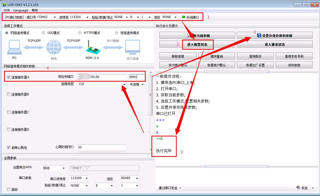 打開串口--->進入配置狀態--->成功的話,會返回執行完畢--->修改服務器地址和端口--->設置并保存參數--->DTU會自動重啟,重啟后會連接服務器