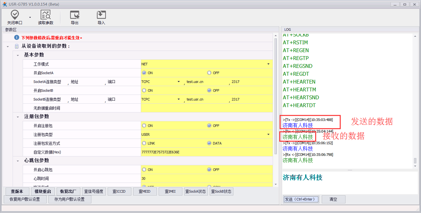 B.可以先讀取下參數(shù),可以看到,出廠默認(rèn)是工作的“NET”模式,服務(wù)器是我司測(cè)試服務(wù)器:test.usr.cn,端口號(hào)是:2317