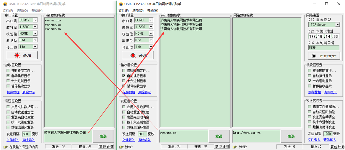 打開兩個串口助手,將兩個設備用串口線接到電腦,一個串口助手發送數據,另一個串口助手能夠正常接收數據。