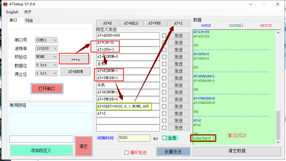 2、打開串口后先點擊“+++ a”,再按照順序發送指令,等待參數設置完成即可(右側數據框返回“LoRa Start!”表示設備設置完成,重啟ok;若改了口數只返回OK,不會打印“LoRa Start!”)