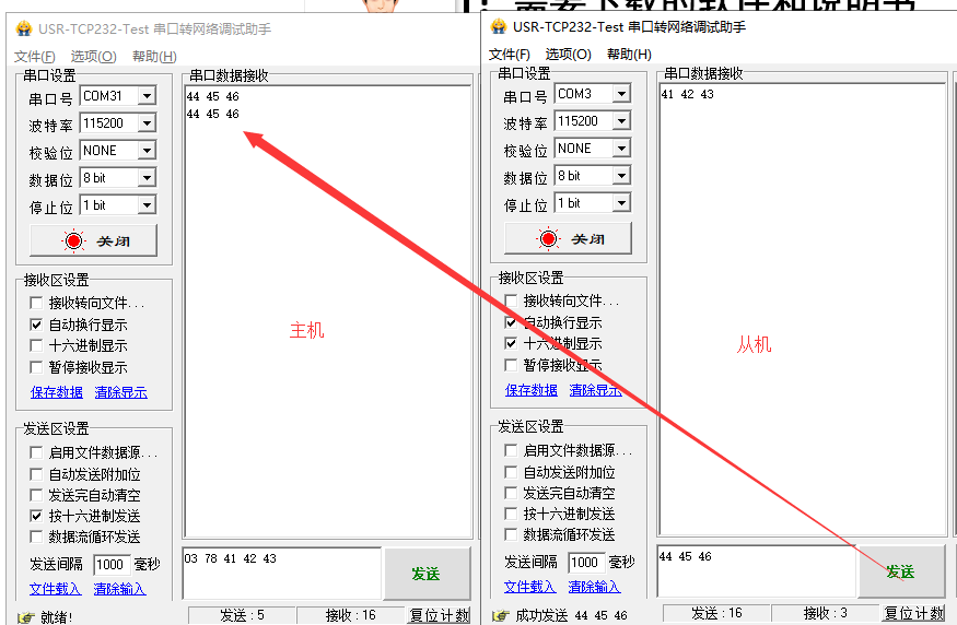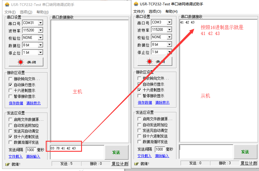2)主機給從機發數據,格式:從機NID(hex) + DATA ,例:向從機(目標地址888(Dec))發送41 42 43(hex),則向串口輸入:03 78 41 42 43
