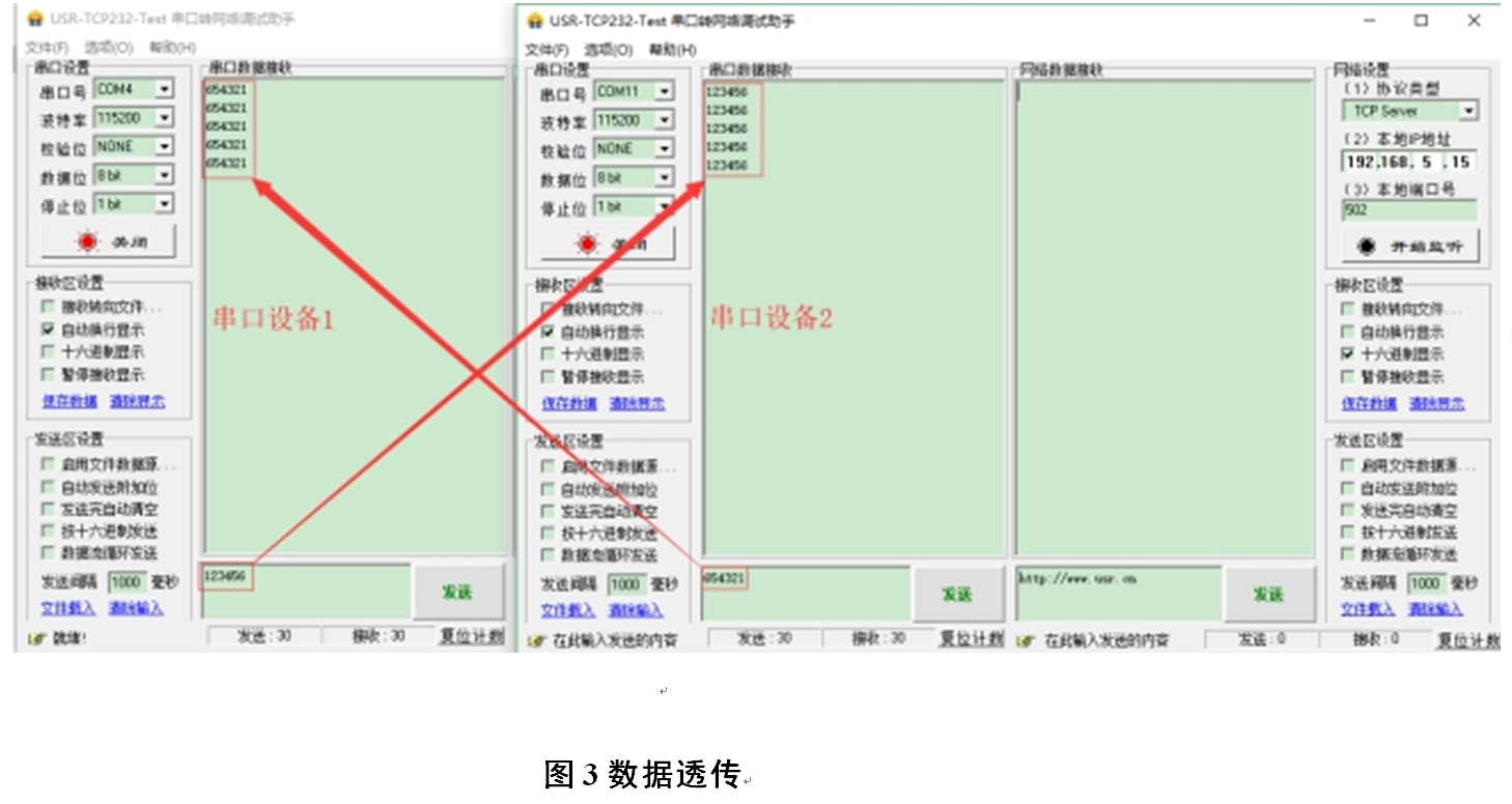 (3)啟動兩個USR-TCP232-Test(模擬串口設備1,2)分別連接LoRa數傳終端A、B的串口,使用串口設備1發送數據串口設備2可接收數據(反之亦然),通信效果如下圖所示: