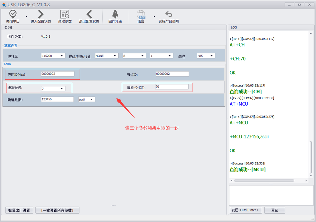設置lora終端的信道速率及應用id和集中器的信道一參數相同。