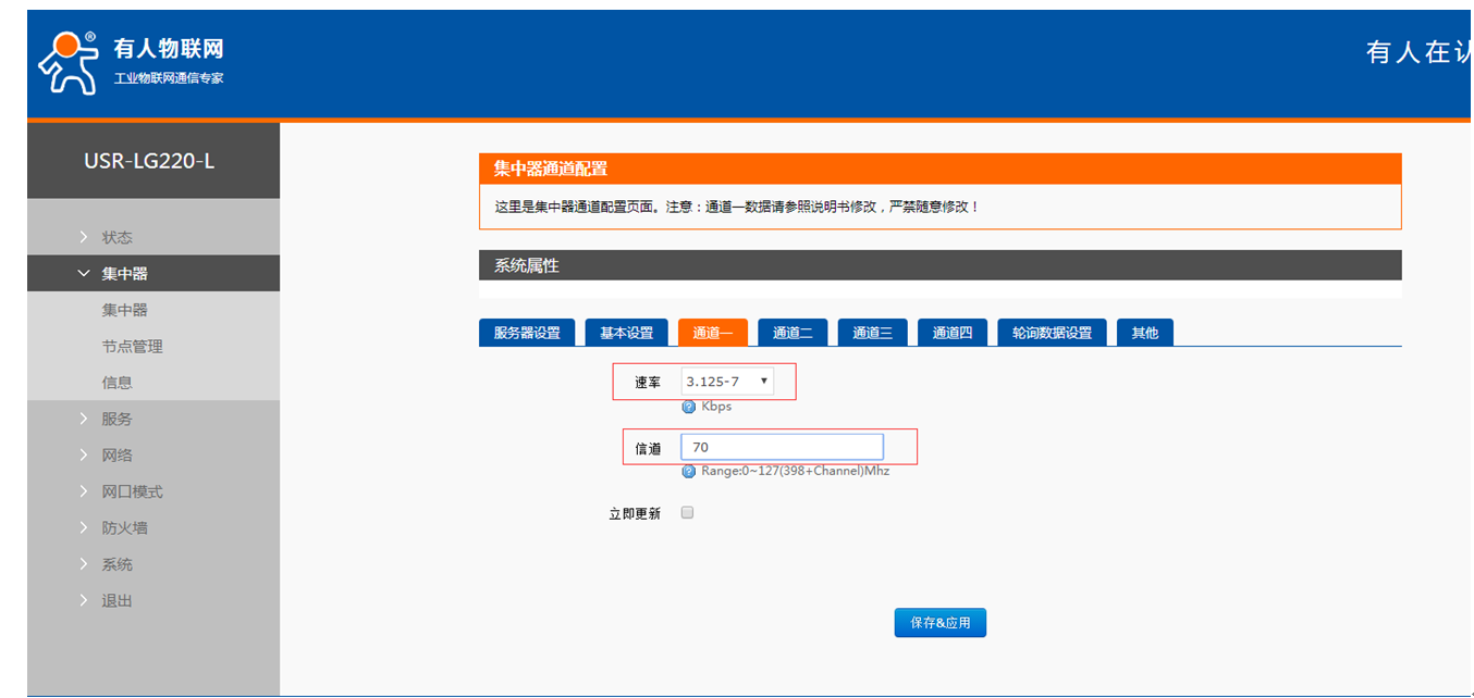 (4) 設置集中器的信道和速率,依次點擊集中器,通道一設置速率和信道和lora相同,點擊保存應用