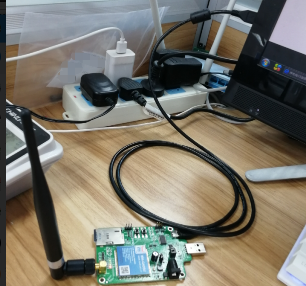 (1) 硬件連接方式1:裝上sim卡,將模塊安裝在測試底板上,接上天線,用普通的安卓數據線將模塊連接到電腦上