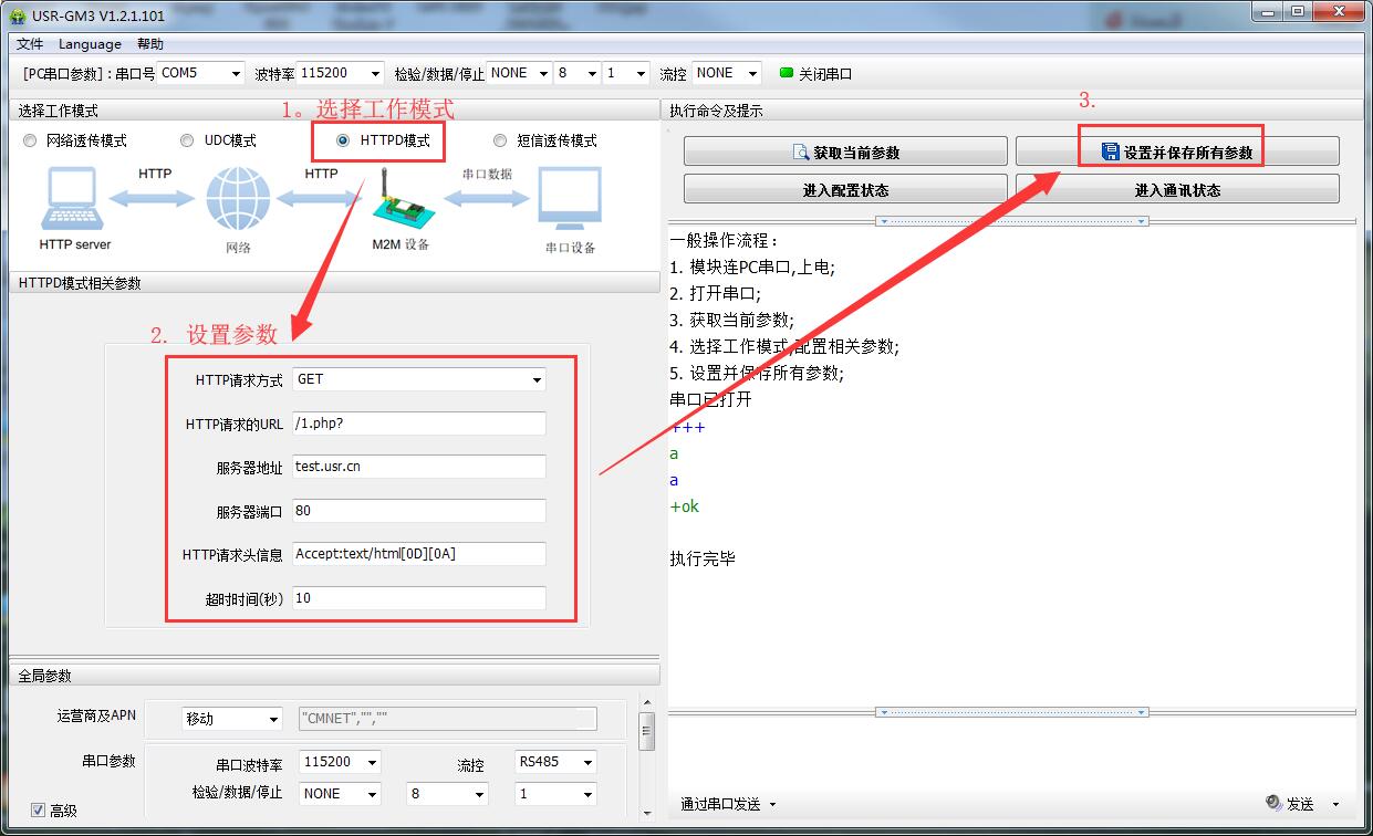 DTU端設置:選擇http模式,設置參數(shù),最后設置并保存所有參數(shù),模塊會自動重啟,重啟后即可測試