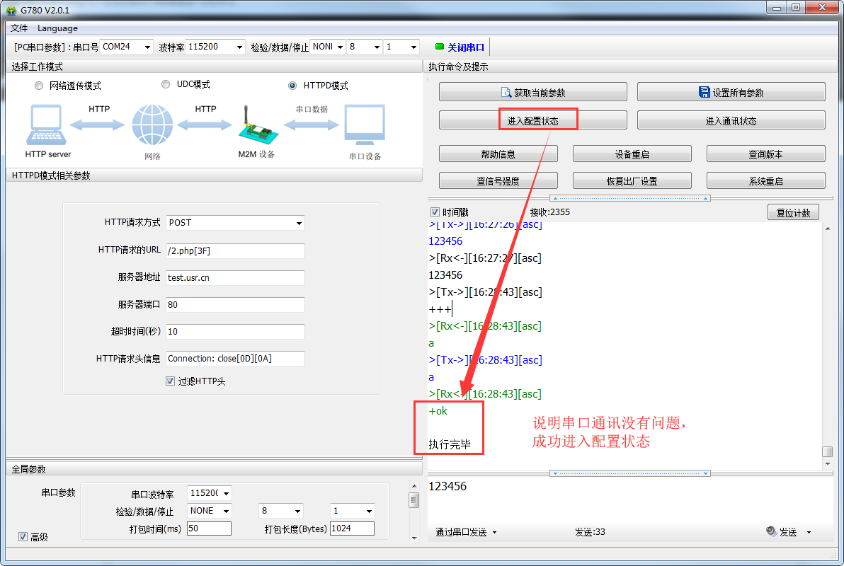 (4)打開串口后,先點擊進入配置狀態,如果模塊能返回+ok的字符,說明電腦和模塊連接是沒有問題的;然后點擊進入通訊狀態,做數據通訊測試。如果不返回+OK的話,請參考(步驟4)
