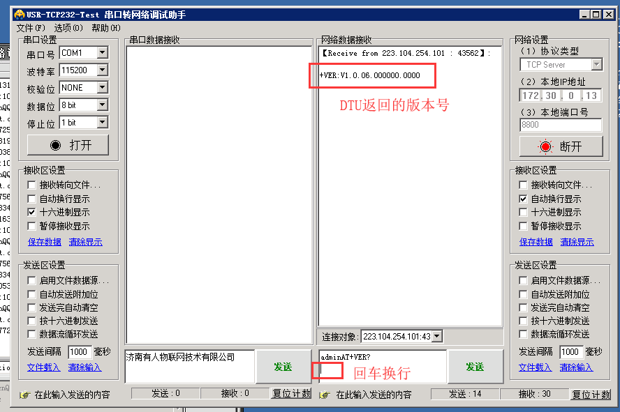 2. 連接成功后,可以從服務器端發送網絡AT指令來查詢/設置DTU的參數