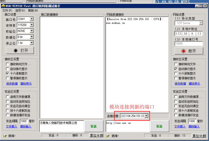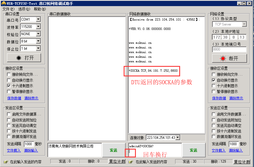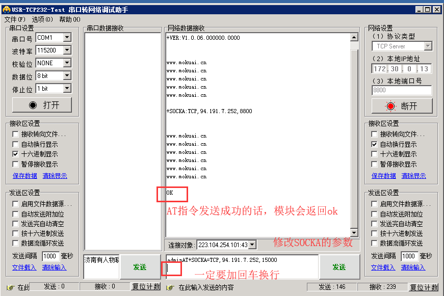 設置SOCKA的參數:adminAT+SOCKA=”TCP”,”94.191.7.252”,15000